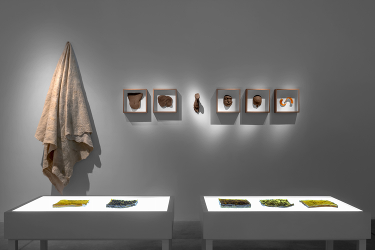 The transformative process of healing is further viscerally intimated in works EX VOTOS that references childhood memories of Pepe’s father’s orthopedic clinic, as well as a Costa Rican pilgrimage tradition. Both are ritualised sites of profound faith and a very human yearning for repair, whether in the sympathetic magic of a basilica Chamber of Miracles, or the performed rationality of modern medicine. At the end of the pilgrimage, devotees make small golden and silver medallions depicting ailing body parts which are hung on a particular wall as a way to ask for improved health or another boon, or mounted in gratitude for healing, or another benediction received. But here, human body parts are interspersed with animal ones, suggesting a kind of hybrid interspecies structuring.nThere is an understanding here that healing must necessarily be collective—we can’t get better alone—but also, fascinatingly, might require the built environment too. As a whole, the show suggests the locavorist maxim that what grows together grows together. The “three sisters” of corn, beans, and squash, for example, or tomatoes, eggplants and zucchinis. Or more precisely, what grows together should be shown together: shrouded, shed, and finally stitched together.