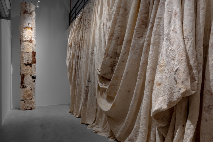 As for the absent body that the shroud intimates? It has already made its way upstairs, in the form of Shedding (2023), a life sized cast of the artist’s body, laid out on a morguelike slab. The piece is the aftermath—an afterbirth as well as an shroud—of a 12-hour durational performance in which performers clad in disposable blue hazmat suits wet and felted wool directly onto Pepe’s body in an exploration of funerary rites and a millenia-long history ovine-human symbiosis. This shedded snakeskin analogue reverberates across floors in the jute netting that used to sag and fall off a building in Pepe’s Beirut neighbourhood like scabs. They are sutured together with felted wool in a series of works URBAN SHROUDS that further collapses the distance between shroud and safety textiles, and between the urban and human bodies.